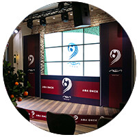 сцена, программируемый свет по периметру зала, звуковое оборудование для работы ведущих или музыкантов