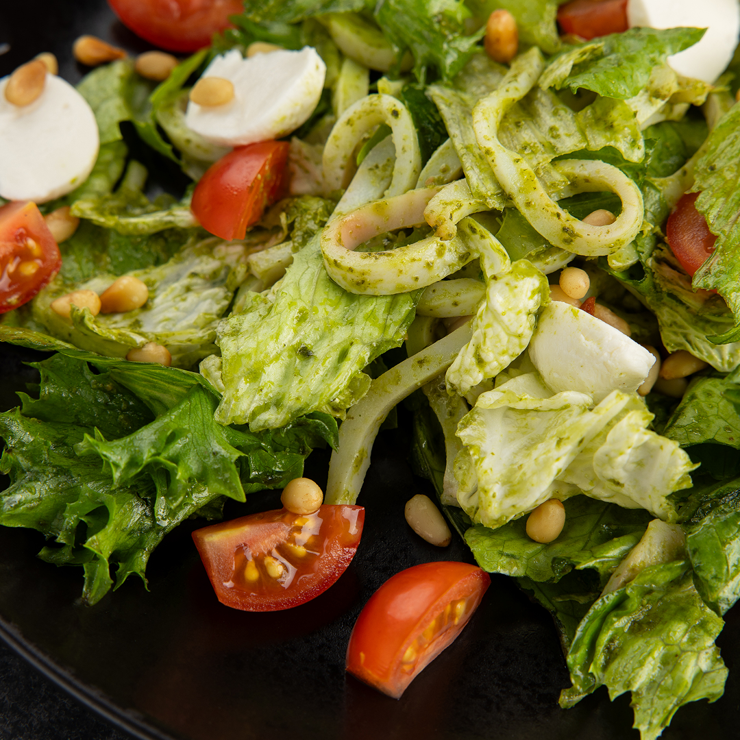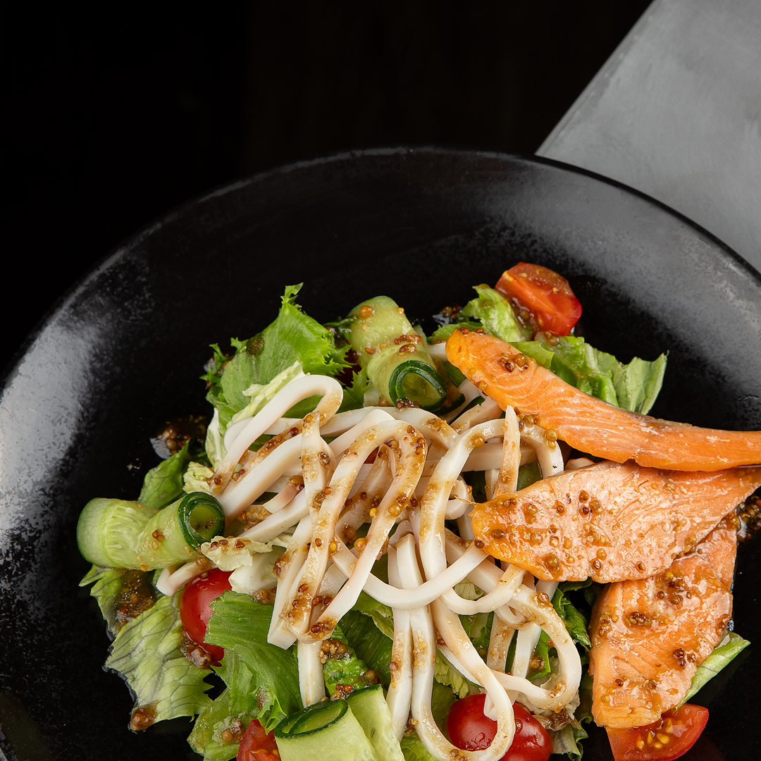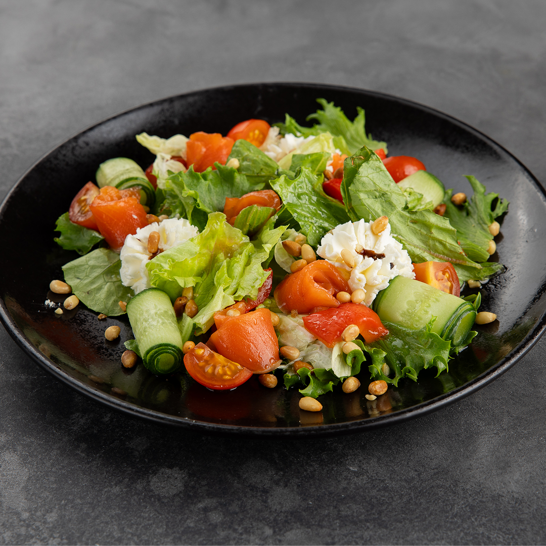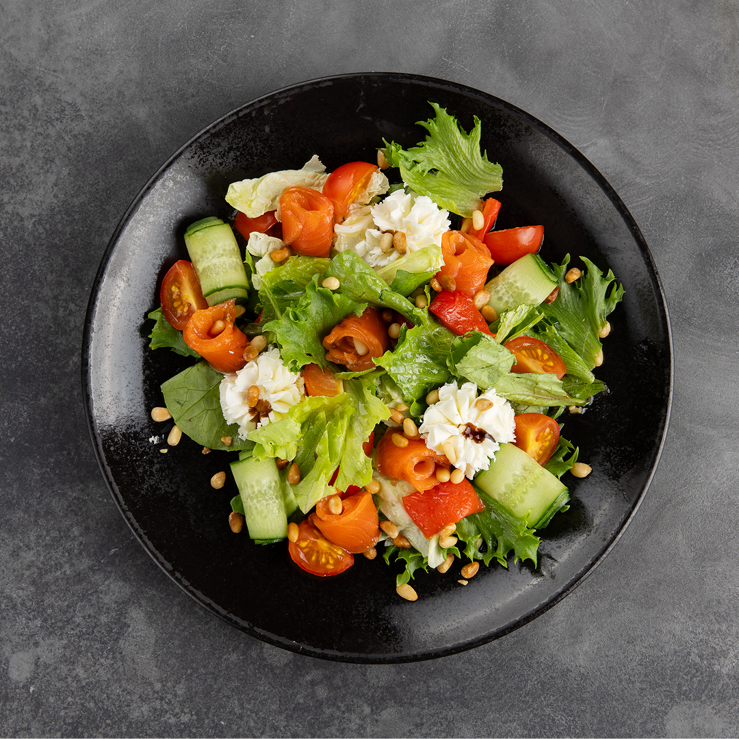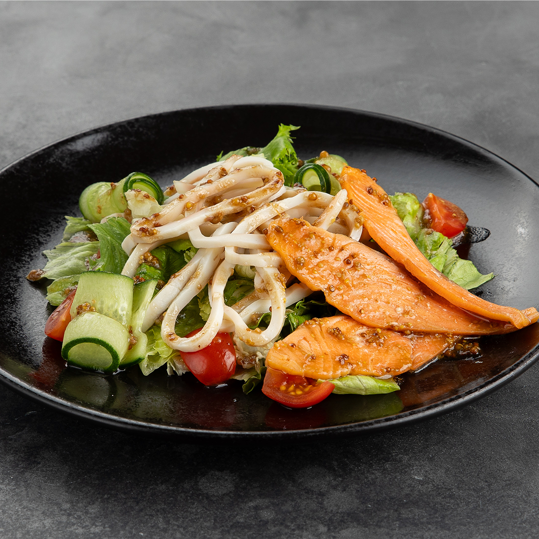 лосось филе | кальмары | огурец | томаты вяленые | черри | микс салата | арахис