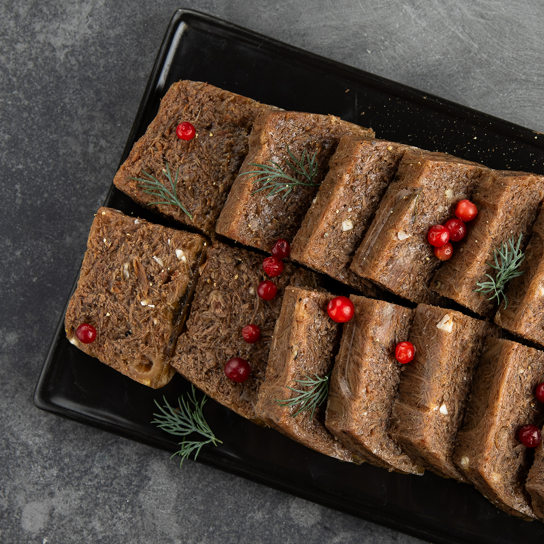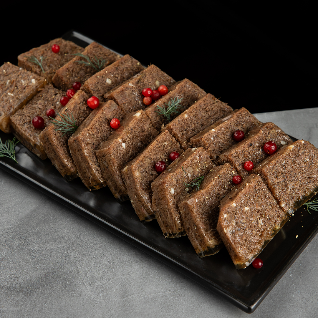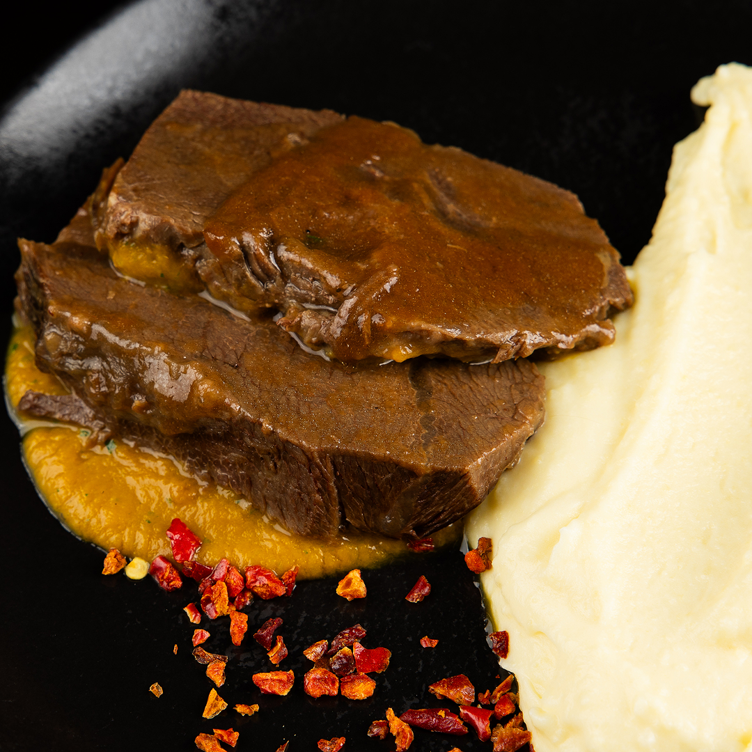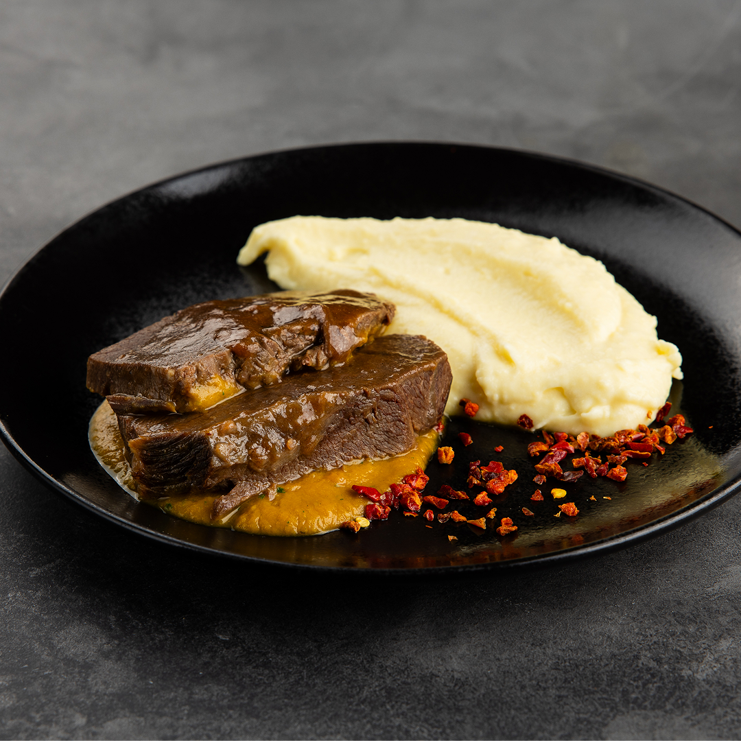 томленые щеки размятые на волокна запекаются под прессом | подаются в форме брикета покрытый глазурью с соусом из овощей