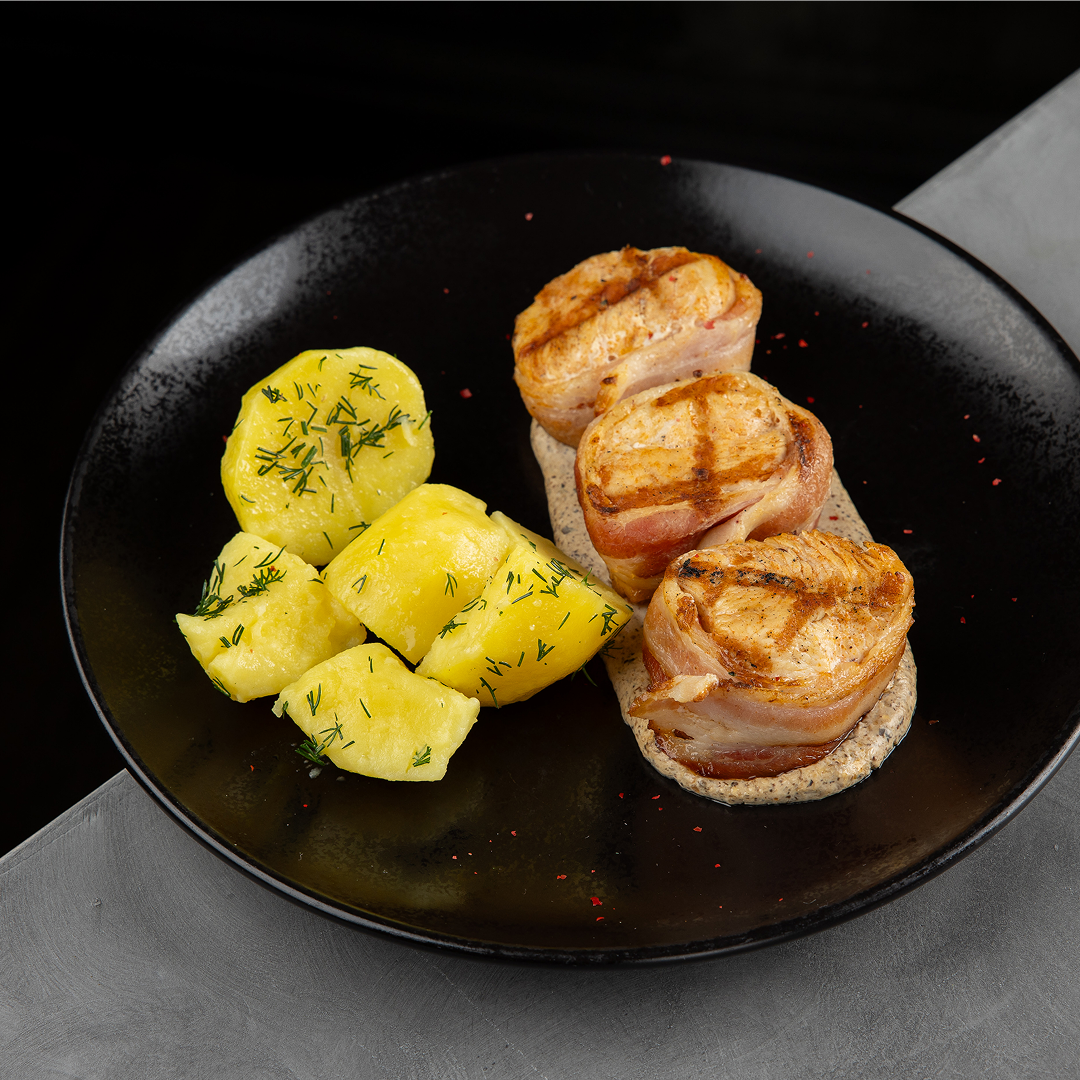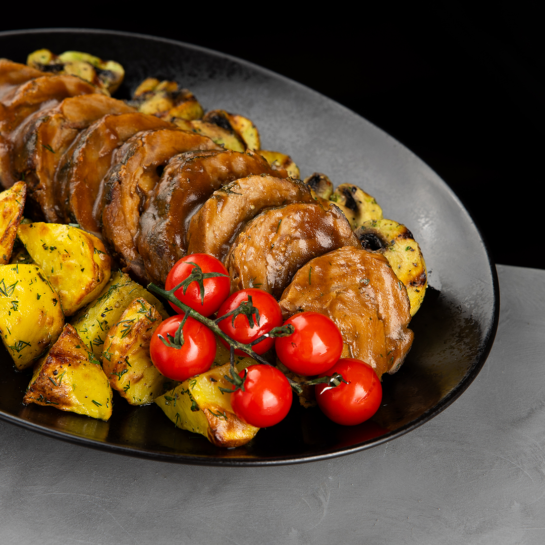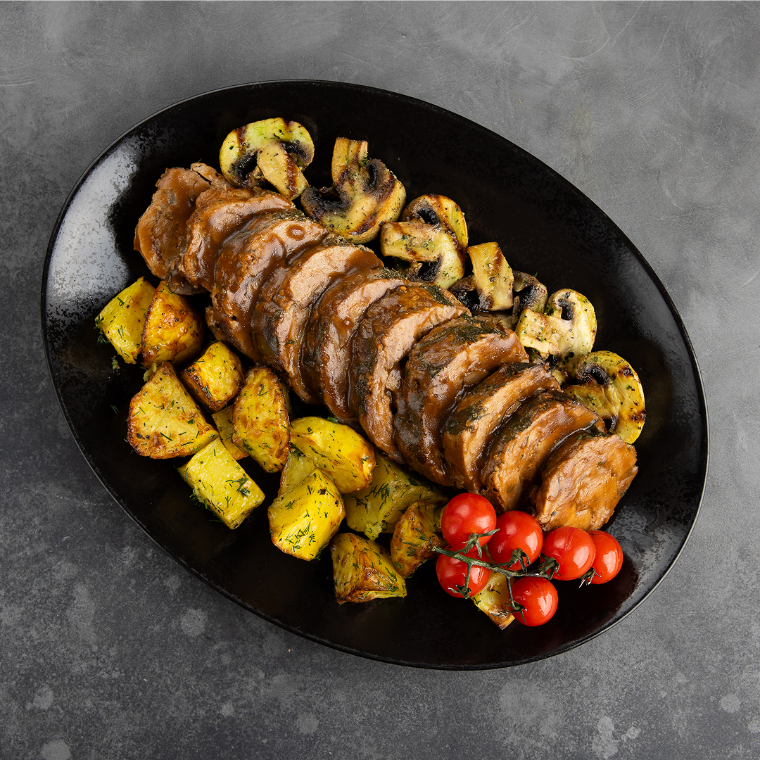 свинина замеченная в рулете с начинкой из бекона | шампиньоны | черри | картофель | соус томатный