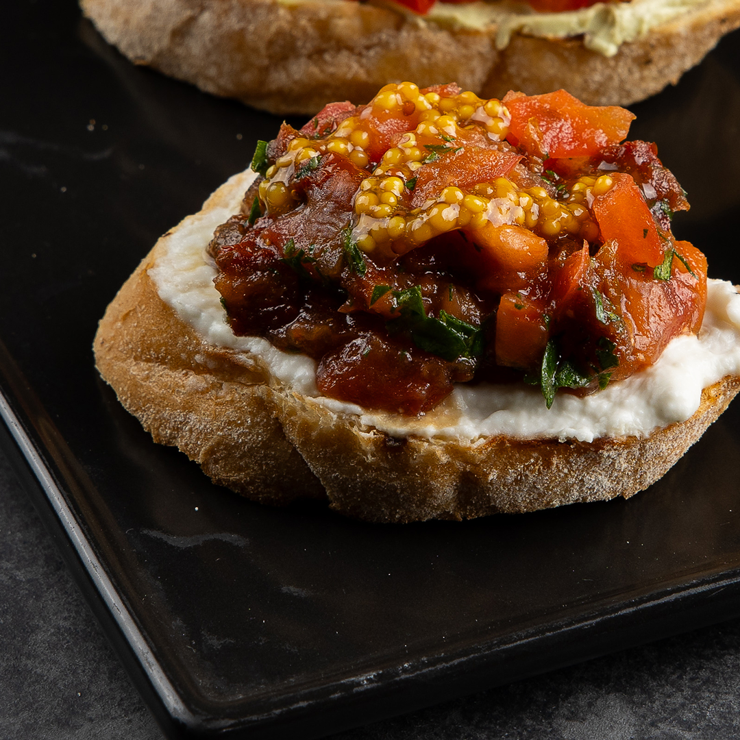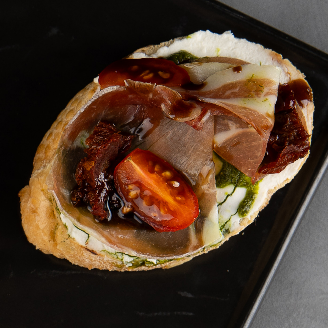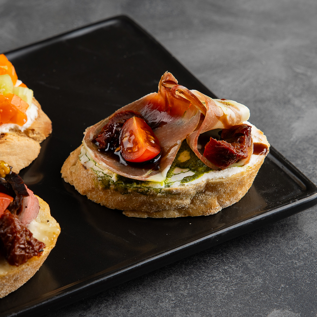 багет | томаты свежие | томаты вяленные | горчица | сливки | моцарелла | бальзамик | наршараб