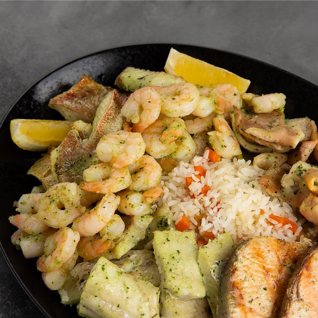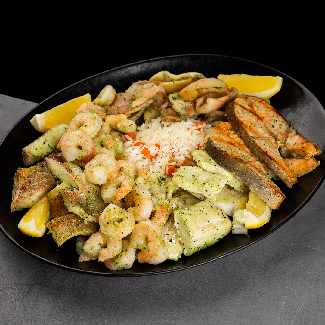 рис с овощами | морской окунь | судак | лосось| креветки | кальмар | лимон | соус икорно-сливочный