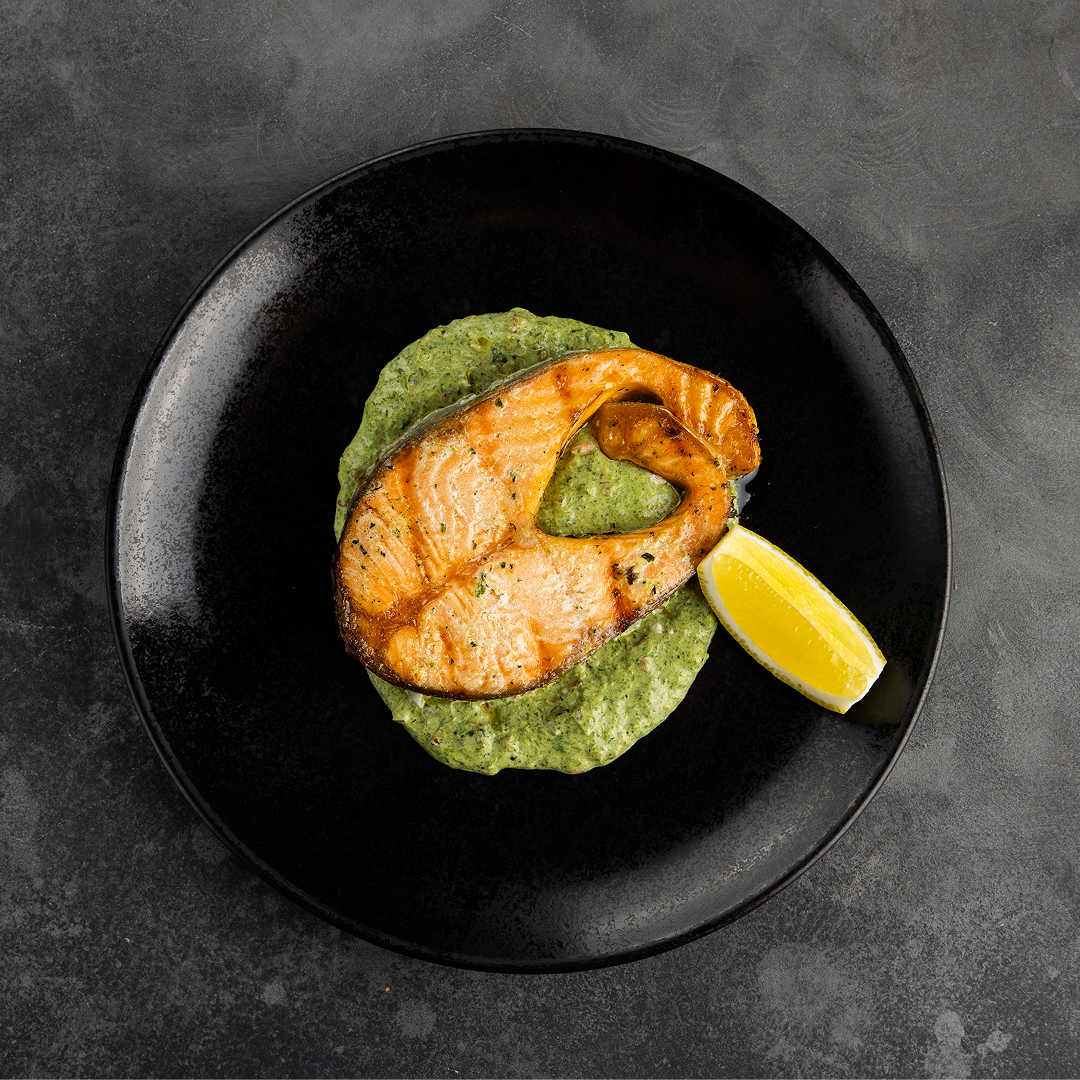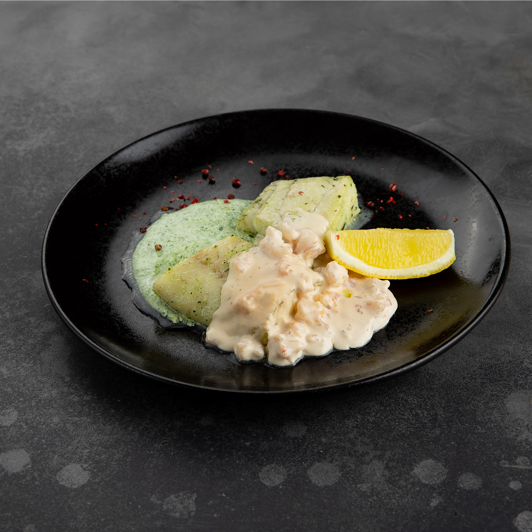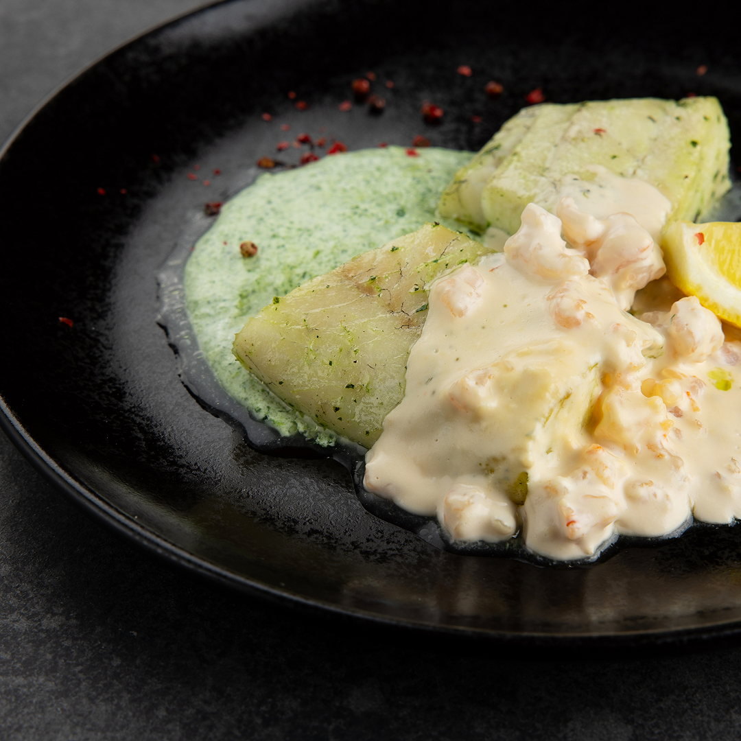 подушка из шпината со сливками | филе судака | сливочно-креветочный соус