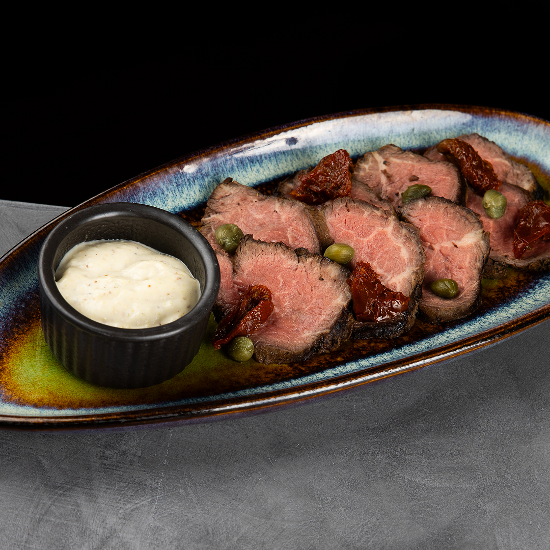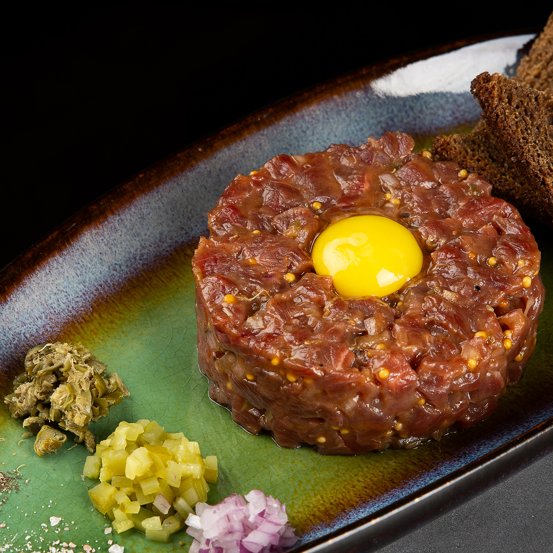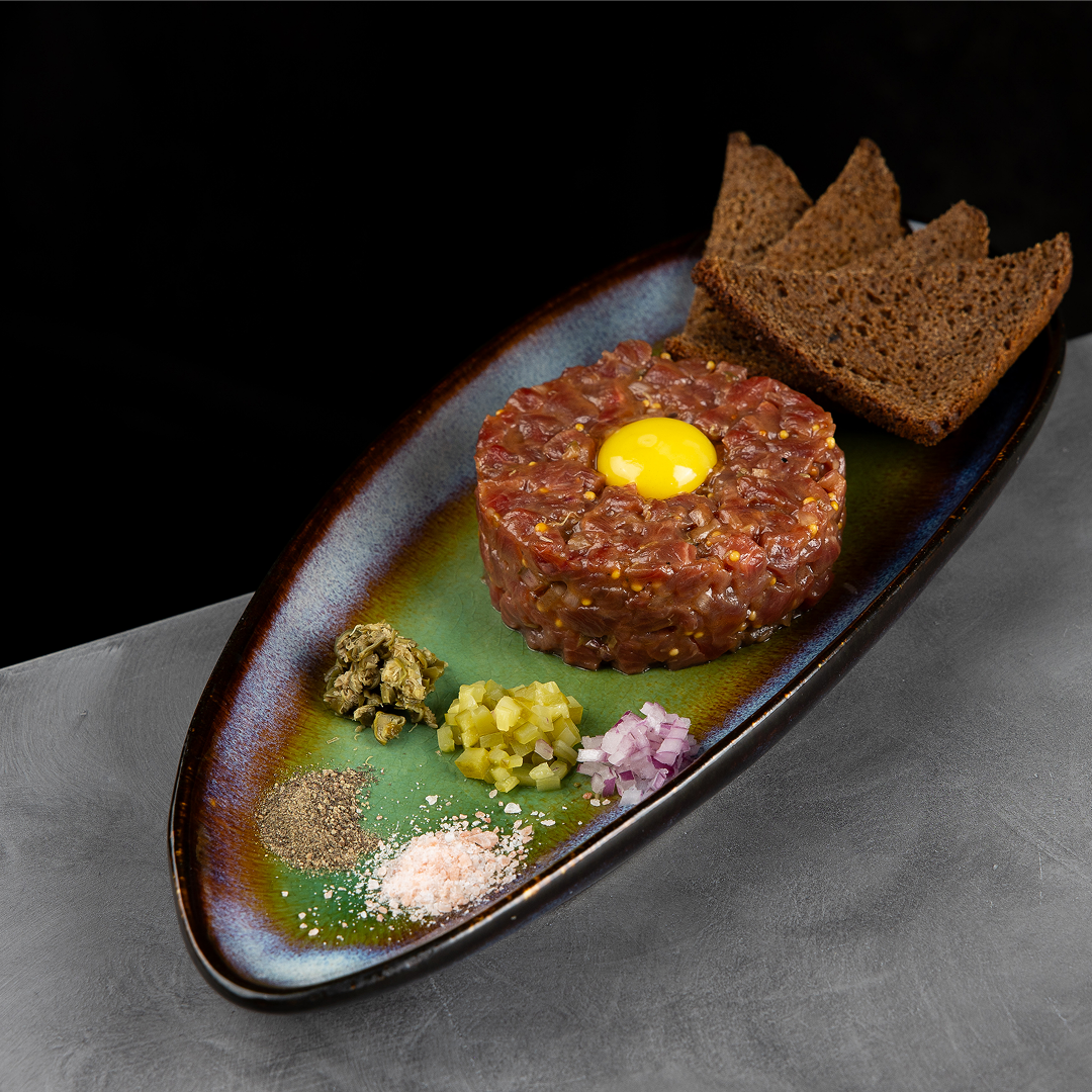 говядина | каперсы | огурец маринованный | лук | соль | перец | дижонская горчица | желток перепелиного яйца