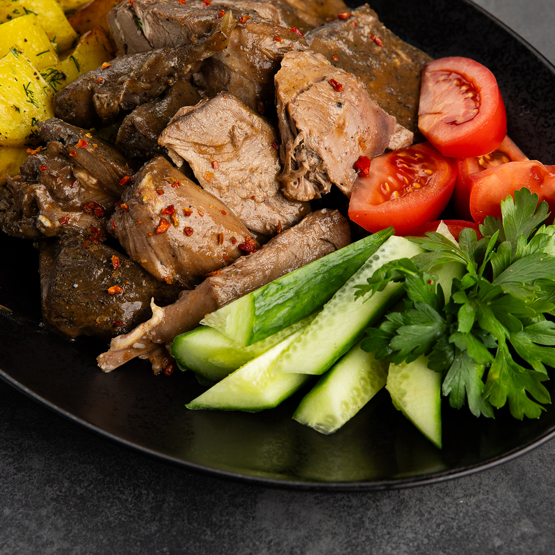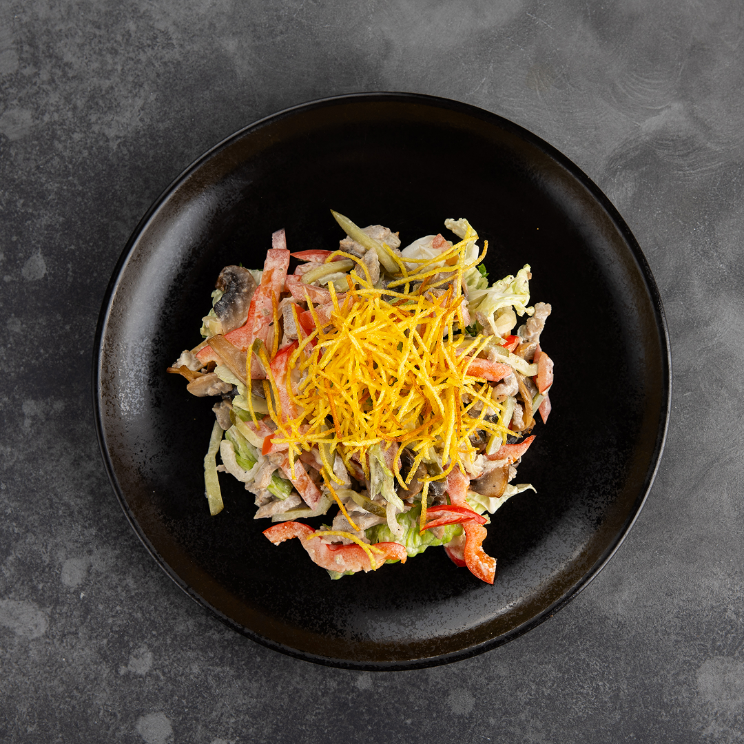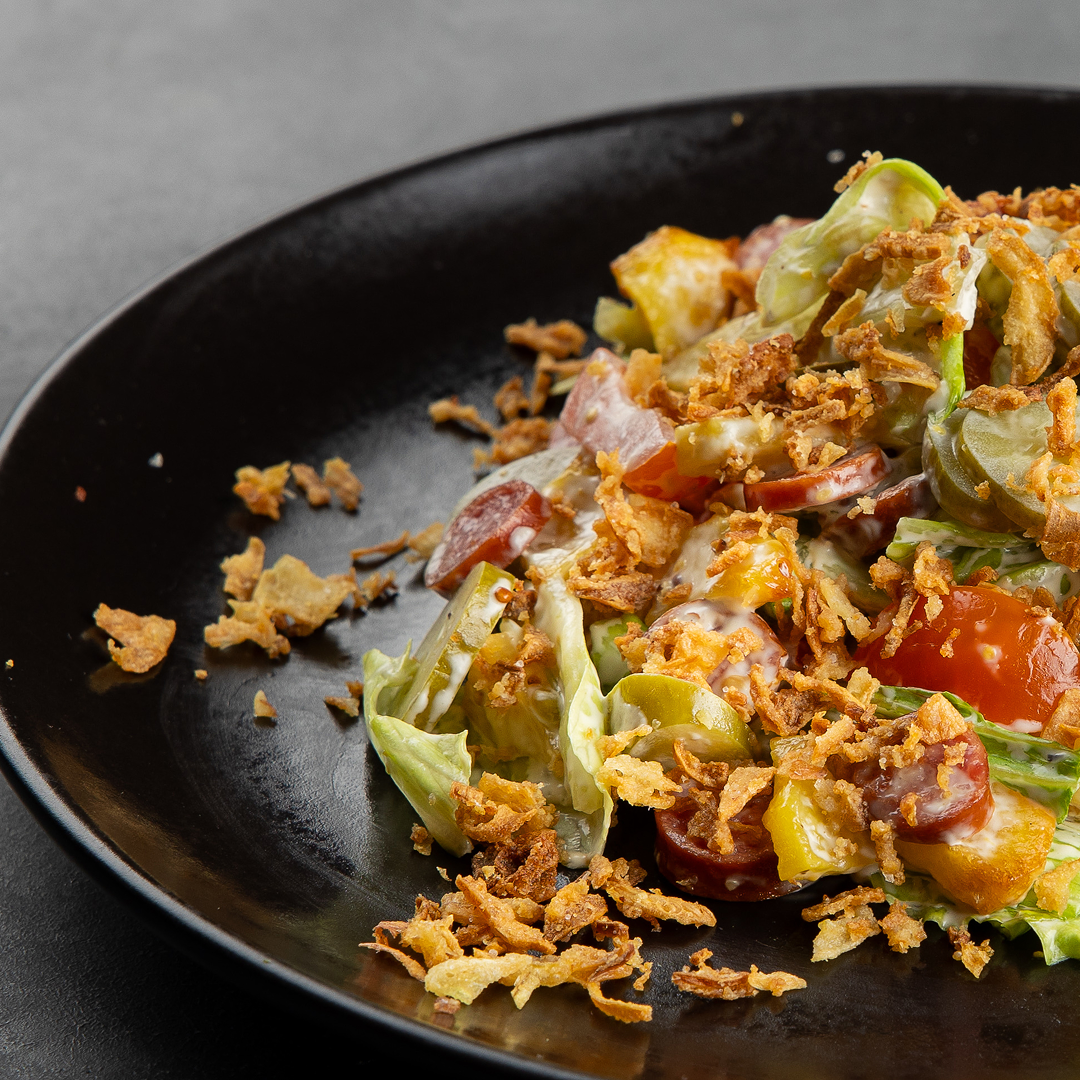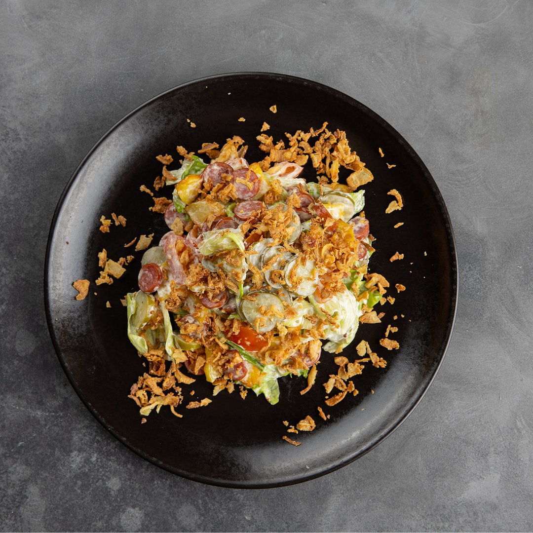 свинина | лук репчатый | перец болгарский | огурец маринованный |шампиньоны | томаты | майонез | соус кимчи | микс салата | картофель пай