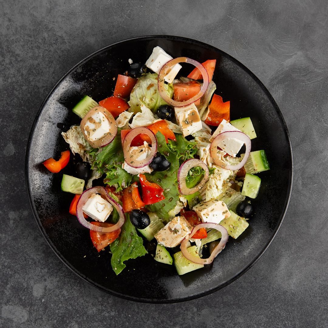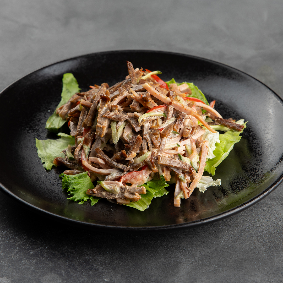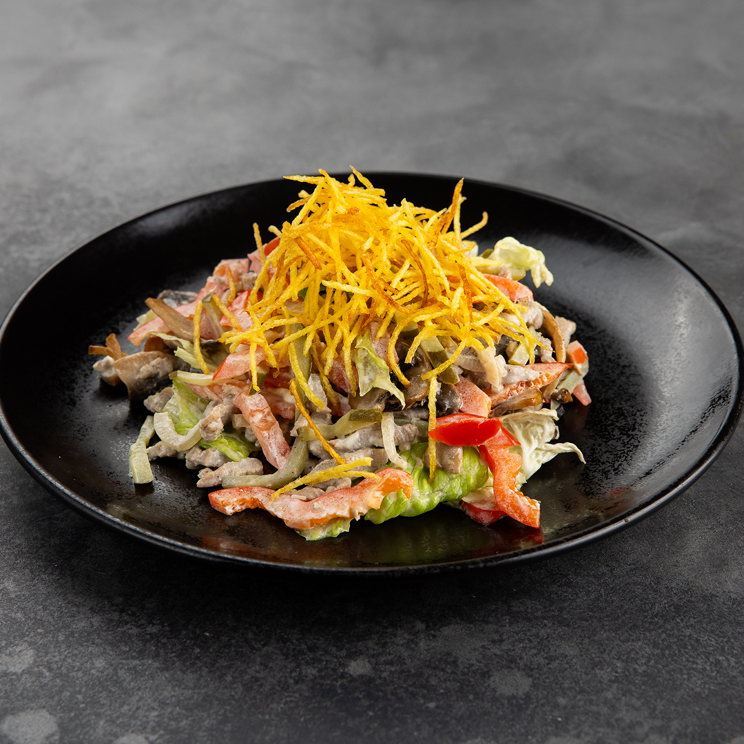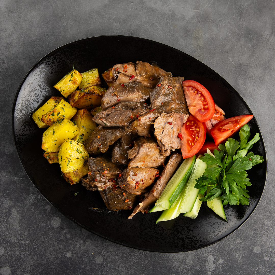 свинина | лук репчатый | перец болгарский | огурец маринованный |шампиньоны | томаты | майонез | соус кимчи | микс салата | картофель пай