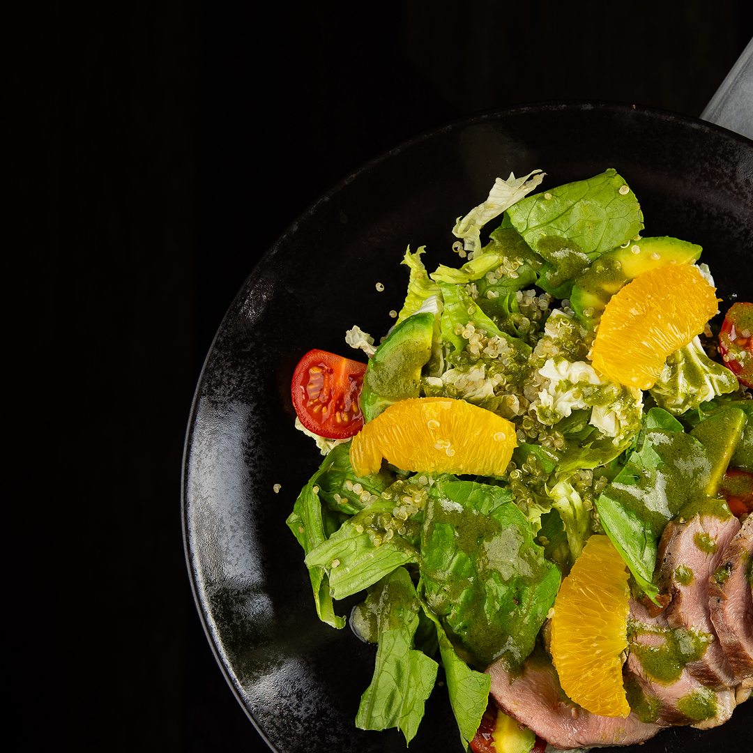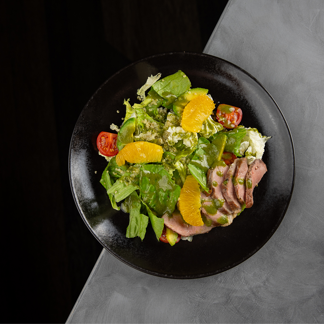 утка | салат микс | авокадо | апельсин | киноа | мята | базилик | масло оливковое