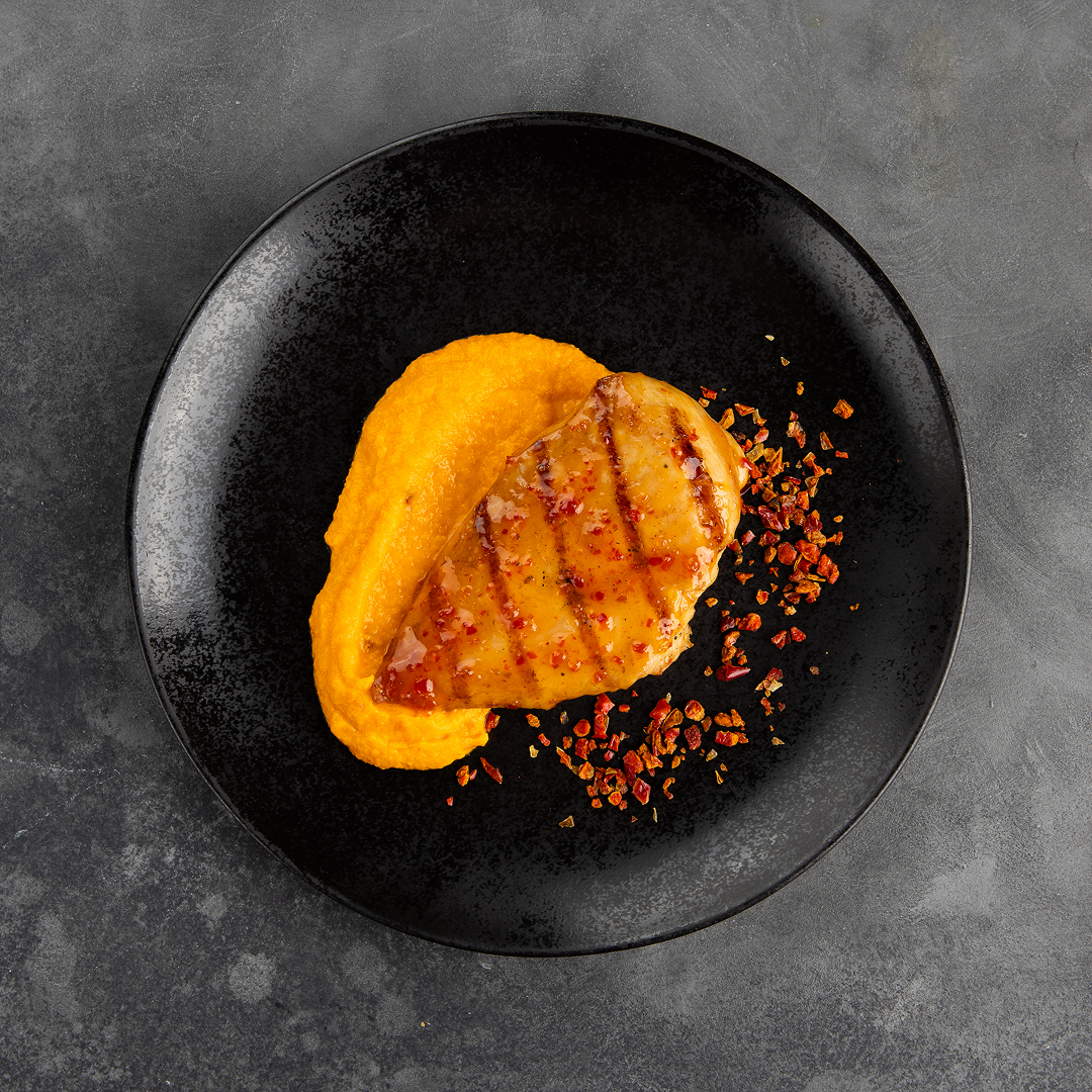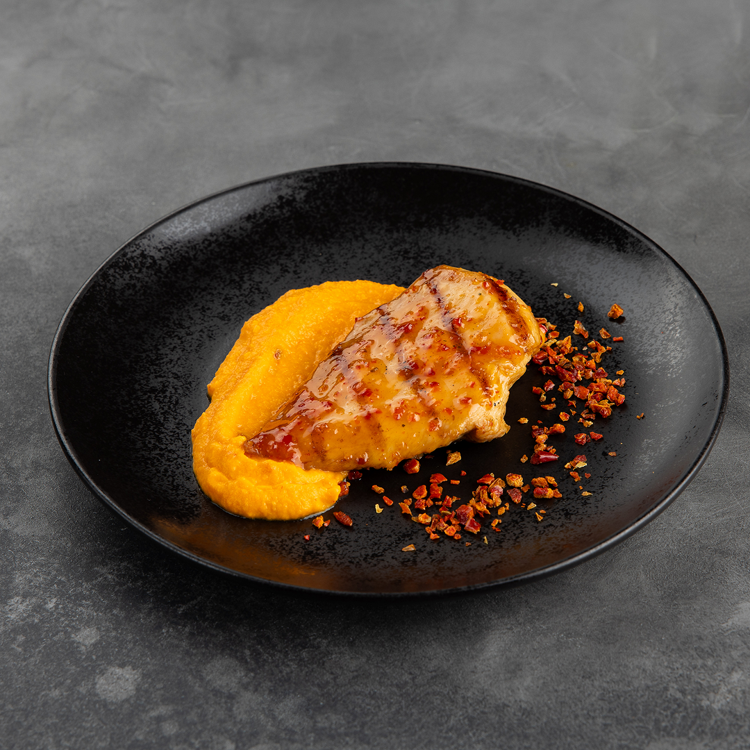 маринованная куриная грудка на гриле | морковь | лук | перец: тушеные в кисло-сладком соусе